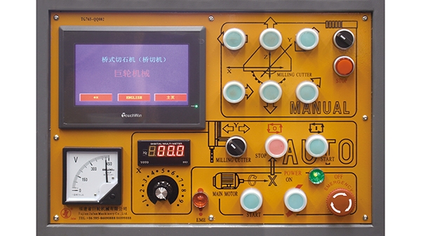 該機采用PLC可編程控制系統(tǒng)和人機操作界面,輔以高精度旋轉(zhuǎn)編碼器定位及紅外線標線器,左右行走采用變頻器控制,可根據(jù)石材材質(zhì)進行調(diào)速,上下升降采用液壓升降,關鍵部位均采用進口零部件,因而具有切割效率高、穩(wěn)定性高、操作簡便等優(yōu)點,特別適用于異形、墓碑、路沿石的切割。